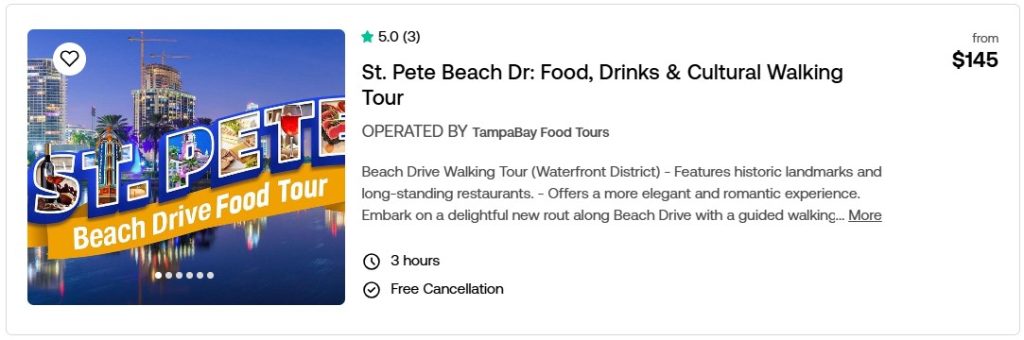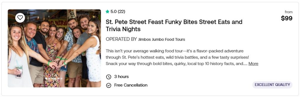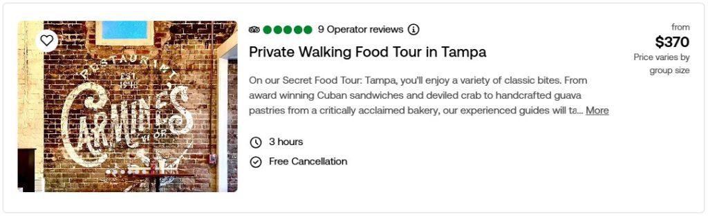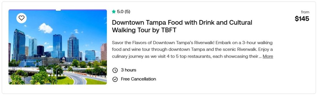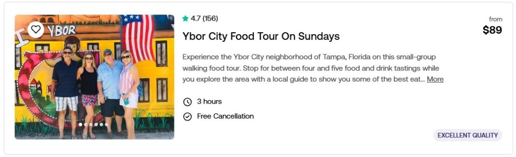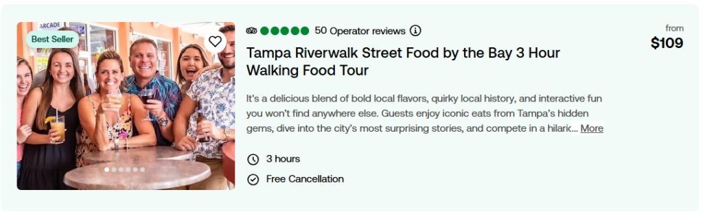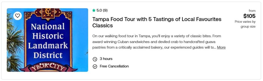 Purchase discounted tickets to the best meals and food tours around the Tampa Bay Region. Compare prices and locations below. Click the picture to read more about them on our Viator page. Reserve now and pay later.